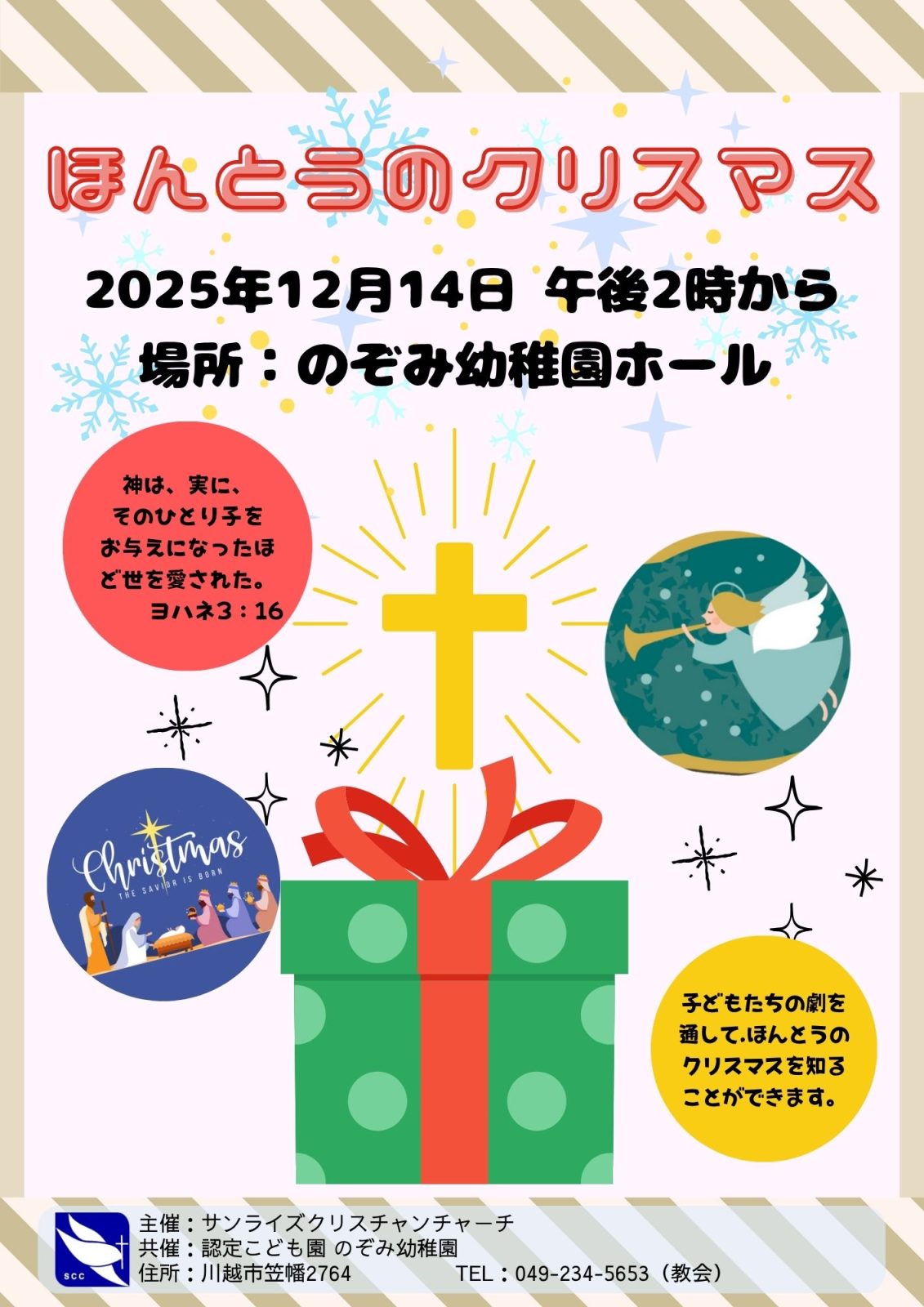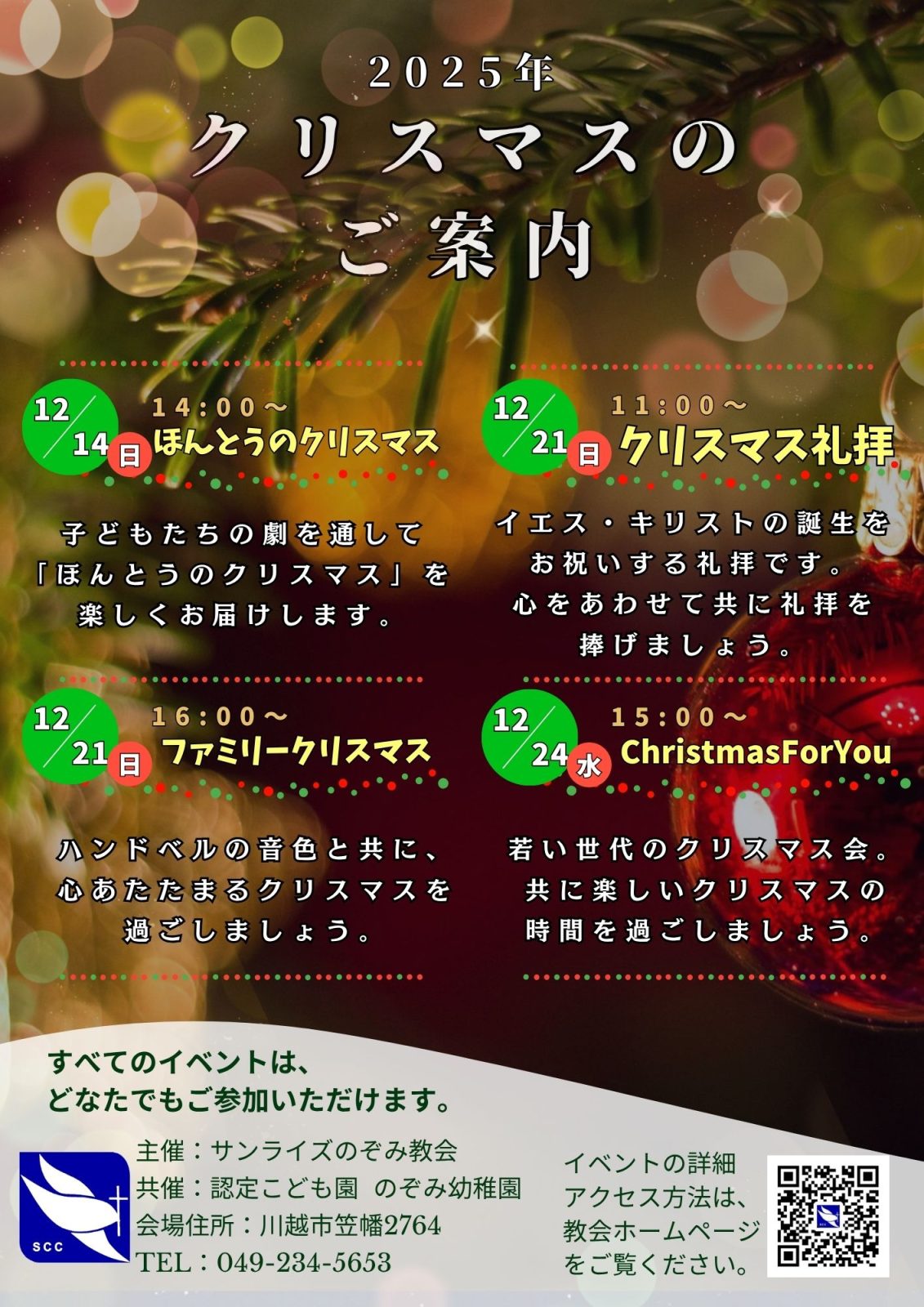 サンライズのぞみ教会のクリスマスのイベントについて すべてのクリスマスイベントは、どなたでもご参加いただけます。教会が初めての方も、どうぞ安心してお越しくださ...